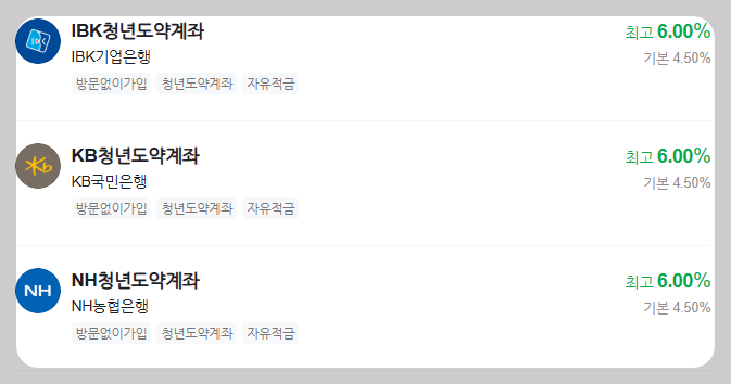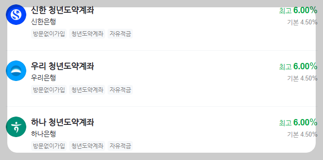 각 은행별로 청년도약 계좌에 대해 기본금리 외 우대금리를 제공합니다. 조건 충족 시 최대 6%에 가까운 고금리를 받을 수 있어 훨씬 더 많은 금액을 받을 수 있습니다. 똑같이 최고 6% 이지만 우대조건을 비교하여 본인에게 맞는 은행을 찾으시면 됩니다.