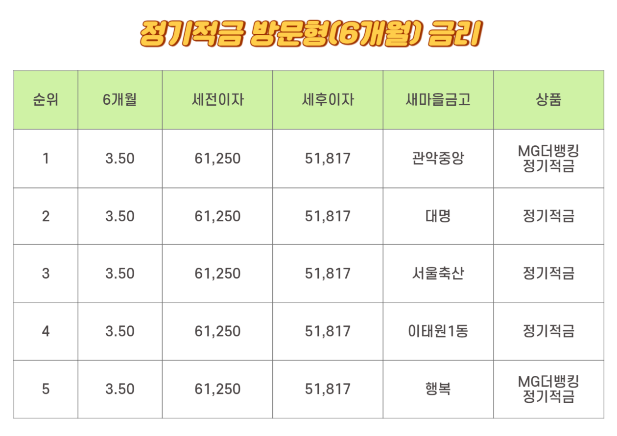 6개월 새마을금고 방문형 금리 1위는 5위와 동일합니다. 모두 3.50%입니다. 세전이자는 61,250원이며 세후이자는 51,817원입니다. 관악중앙 MG더뱅킹 정기적금, 대명의 정기적금, 서울축산의 정기적금, 이태원1동의 정기적금, 행복의 MG더뱅킹 정기적금입니다.