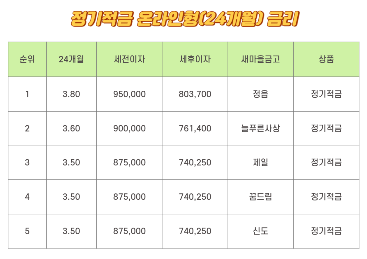 온라인형 24개월 정기적금은 1위가 3.80%입니다. 정읍의 정기적금으로 세 저이 자는 950,000원이며 세후이자는 803,700원입니다. 2위는 3.60%로 늘 푸른 사상의 정기적금입니다. 세전이자는 900,000원이며 세후이자는 761,400원입니다. 3위는 3.50%로 4위와 5위 모두 동일합니다. 세전이자는 875,000원이며 세후이자는 740,250원입니다. 제일의 정기적금, 꿈드림의 정기적금, 신도의 정기적금입니다.