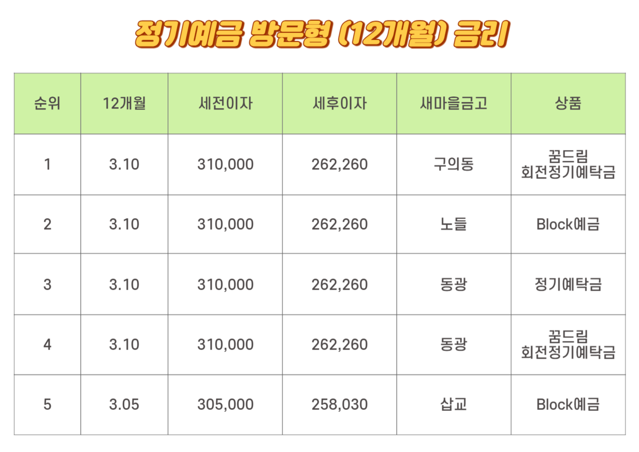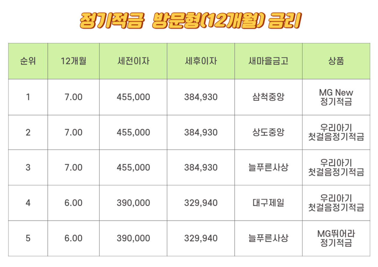 새마을금고 방문형 12개월 금리 1위는 7.00%입니다. 3위까지 동일합니다. 세전이자는 455,000원이며 세후이자는 384,930원입니다. 삼척중앙의 MG New정기적금, 상도중앙의 우리 아기 첫걸음 정기적금, 늘 푸른 사상의 우리아기우리 아기 첫걸음 정기적금입니다. 4위는 6.00%와 5위는 같습니다. 세전이자가 390,000원이며 세후이자는 329,940원입니다. 대구제일의 우리 아기 첫걸음 정기적금, 늘 푸른 사상의 MG 뛰어라 정기적금입니다.
