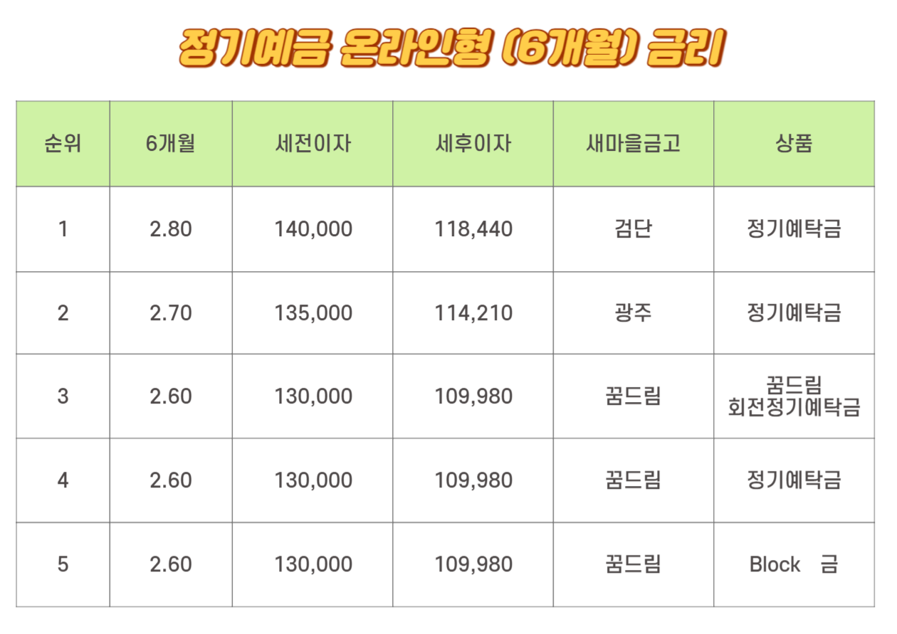 정기예금 온라인형 6개월 금리 1위는 2.80%입니다. 검단의 정기예탁금입니다. 세전이자는 140,000원이며 세후이자는 118,440원입니다. 2위는 2.70%로 광주의 정기예탁금입니다. 세전이자가 135,000원이며 세후이자는 114,210원입니다. 3위부터 5위는 동일합니다. 2.60%로 꿈드림의 꿈드림 회전정기예탁금, 정기예탁금, Block예금입니다.