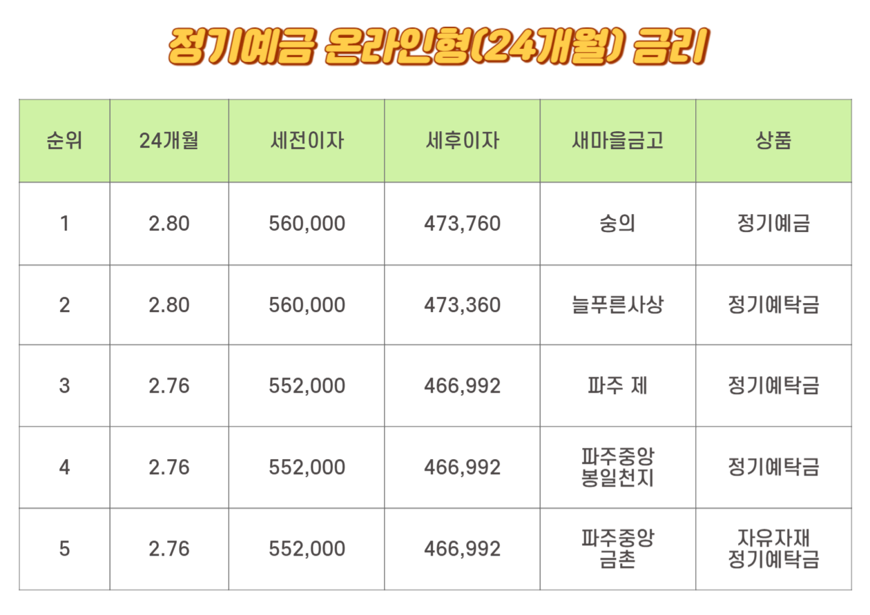 24개월 새마을금고 온라인형 금리 1위는 2위와 동일합니다. 2.80%로 세전이자는 560,000원이며 세후이자는 473,760원입니다. 숭의의 정기예금, 늘 푸른 사상의 정기예탁금입니다. 3위, 4위, 5위는 동일합니다. 2.76%로 세전이자는 552,000원이며 세후이자는 466,992원입니다. 파주의 정기예탁금, 파주중앙봉일천지 정기예탁금, 파주중앙 금촌의 자유자재 정기예탁금입니다.