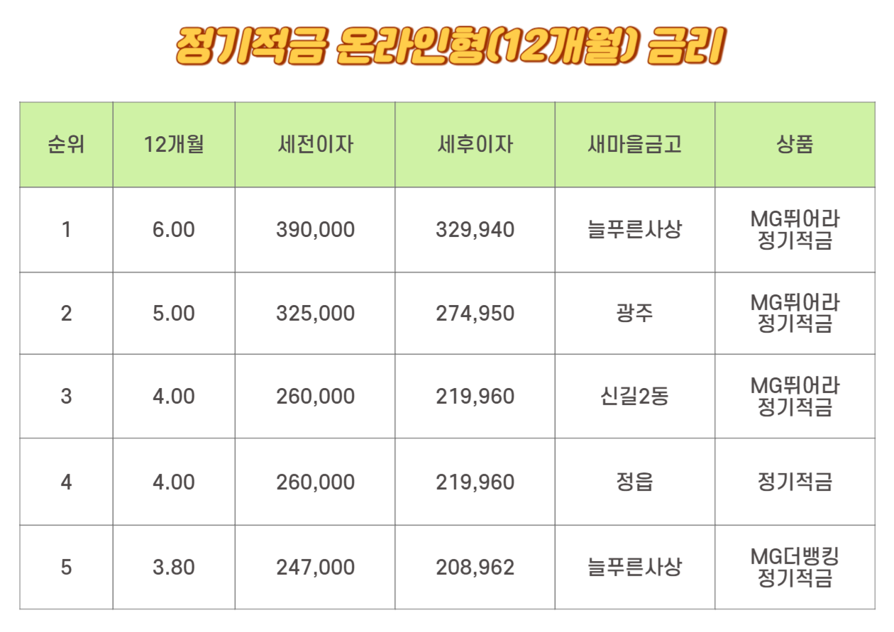 온라인형 12개월 금리 1위는 6.00%입니다. 세전이자는 390,000원이며 세후이자는 329,940원입니다. 늘 푸른 사상의 MG뛰어라 정기적금입니다. 2위는 5.00%로 광주의 MG 뛰어라 정기적금입니다. 세전이자는 325,000원이며 세후이자는 274,950원입니다. 3위와 4위는 동일하게 4.00%입니다. 세전이자는 260,000원이며 세후이자는 219,960원입니다. 신길2동의 MG 뛰어라 정기적금과 정읍의 정기적금입니다. 5위는 3.80%로 세전이자는 247,000원이며 세후이자는 208,962원입니다. 늘 푸른 사상의 MG더뱅킹 정기적금입니다.