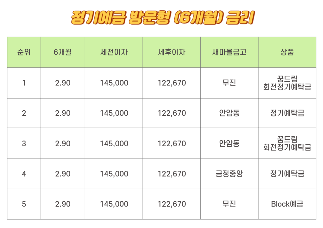 새마을금고 방문형 6개월 금리 1위부터 5위까지는 모두 2.9%로 같습니다. 세전 이자는 145,000원이며 세후이자는 122,670원입니다. 무진에 꿈드림 회전정기예탁금, 안암동의 정기예탁금, 꿈드림 회전 정기 예탁금, 금정중앙의 정기예탁금, 무진의 Block 예금입니다.
