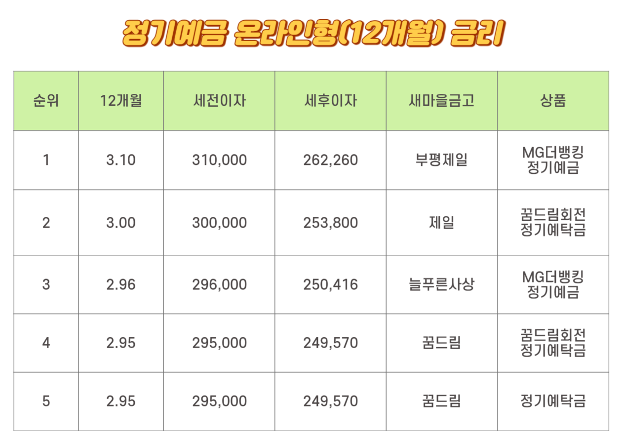 12개월 새마을금고 정기예금 1위는 3.10% 부평제일의 MG더뱅킹 정기예금입니다. 세전이자는 310,000원이며 세후이자는 262,260원입니다. 2위는 3.00%로 제일의 꿈드림회전 정기예탁금입니다. 세전이자는 300,000원임여 세후이자는 253,800원입니다. 3위는 2.96%로 늘 푸른 사상의 MG더뱅킹 정기예금입니다. 세전이자는 296,000원이며 세후이자는 250,416원입니다. 4위와 5위는 동일하게 2.95%입니다. 꿈드림의 꿈드림 회전 정기예탁금, 정기예탁금입니다. 세전이자는 295,000원이며 세후이자는 249,570원입니다.
