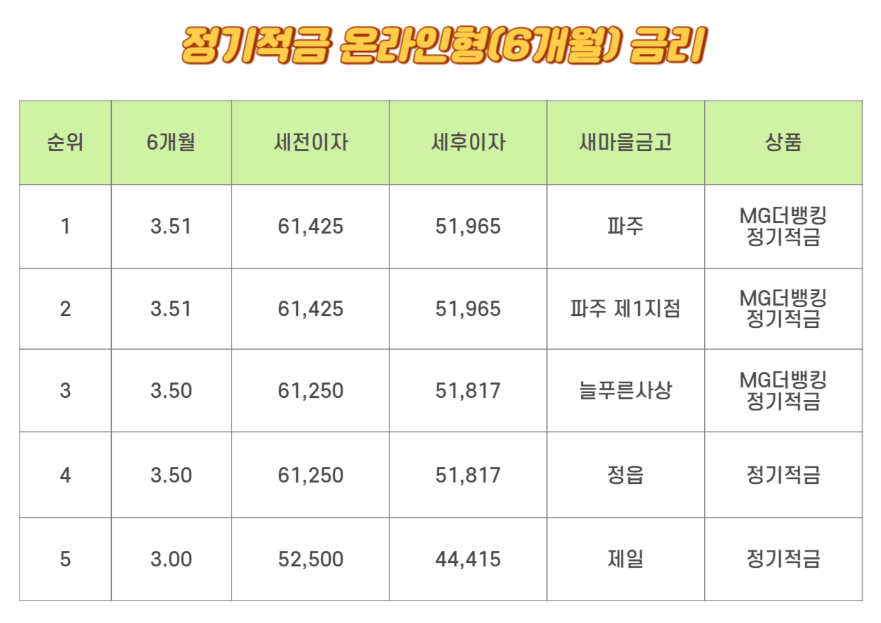 온라인형 6 개원 금리 1위는 2위와 동일합니다. 세전이자는 61,425원이며 세후이자는 51,965원입니다. 파주 MG더뱅킹 정기적금, 파주 제1 지점의 MG더뱅킹 정기적금입니다. 3위와 4위는 동일하게 3.50%입니다. 세전이자는 61,250원이며 세후이자는 51,817원입니다. 늘 푸른 사상의 MG더뱅킹 정기적금과 정읍의 정기적금입니다. 5위는 3.00%로 제일의 정기적금입니다. 세전이자는 52,500원이며 세후이자는 44,415원입니다.