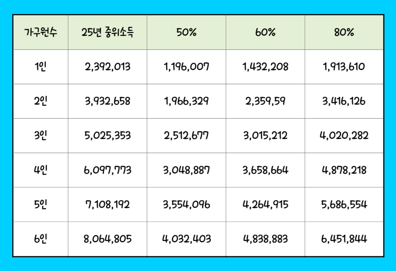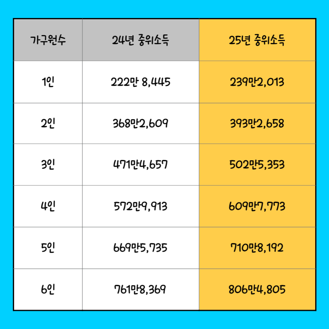 2025년의 기준 중위소득 인상이 되어서 많은 분들이 혜택을 누리실 수 있게 되셨습니다. 매년 기준중위소득을 확인하시고 내가 받을 수 있을 지 확인해 보신 뒤 많은 혜택을 받으실 수 있었으면 좋겠습니다.