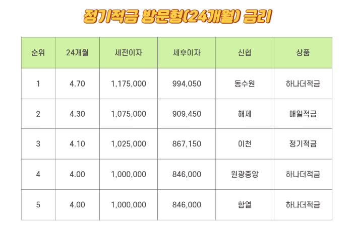 정기적금 방문형 24개월 금리는 1위가 4.70%입니다. 동수원의 하나더 적금이며 세전이자는 1,175,000원이며 세후이자는 994,050원입니다. 2위는 4.30%로 해제의 매일적금입니다. 세전이자는 1,075,000원이며 세후이자는 909,450원입니다. 3위는 4.10%로 이천의 정기적금입니다. 세전이자는 1,025,000원이며 세후이자는 867,150원입니다. 4위와 5위는 동일합니다. 원광중앙의 하나 더적금, 함열의 하나 더적금입니다. 세전이자는 1,000,000원이며 세후이자는 846,000원입니다.