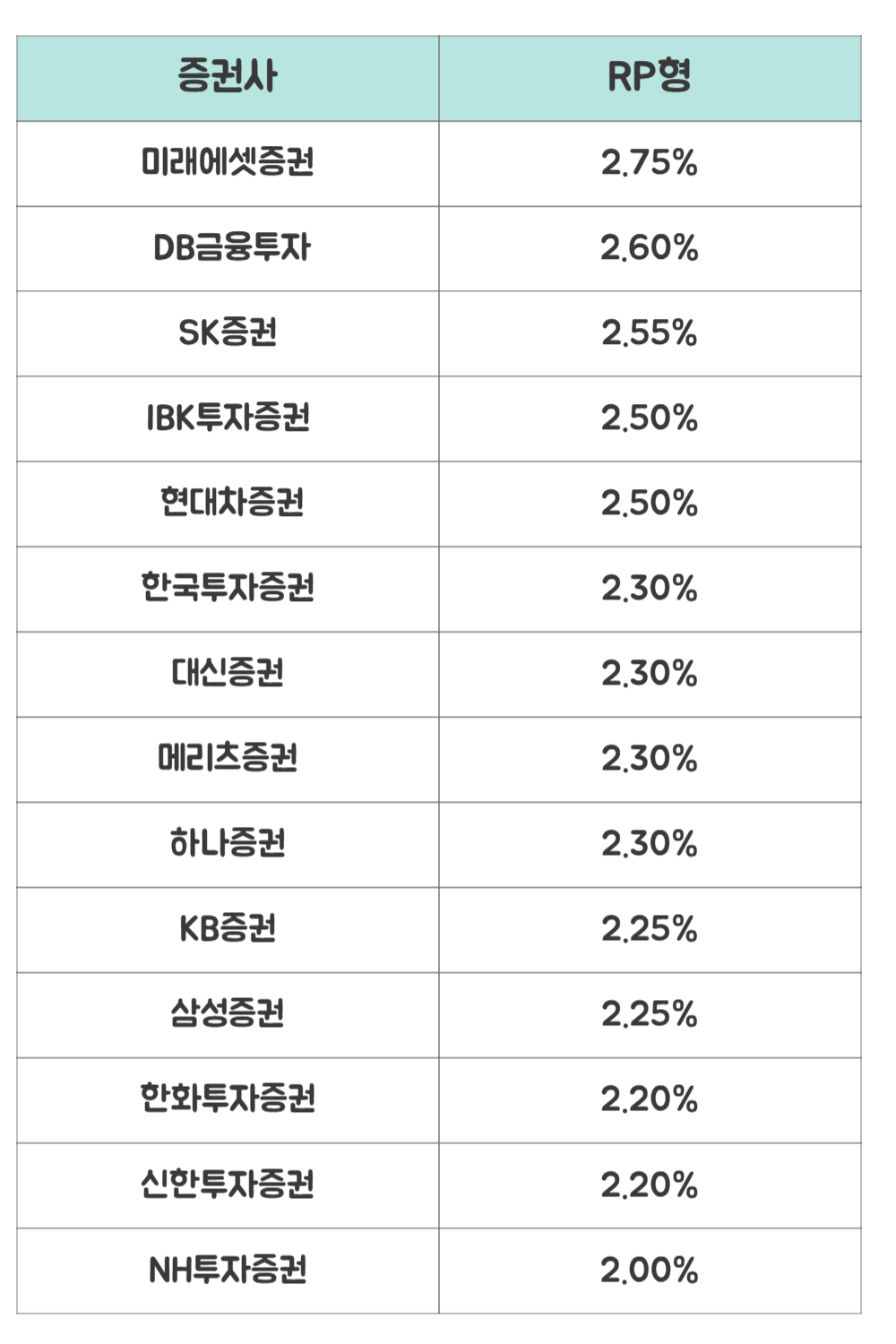 현재 금리시 금리의 큰 차이는 보이지 않습니다. 대부분 RP형으로 가입이 되어 있는데 2.5% 평균입니다. 발행어음 같은 경우에는 증권사의 신용등급에 영향이 있으므로 잘 확인하셔야 합니다. RP형은 상대적으로 금리가 낮지만 원금 손실이 적은 편으로 대부분 많이 사용하십니다. 단기적으로 여유자금 파킹 할 때에는 좋은 선택인 상품입니다.