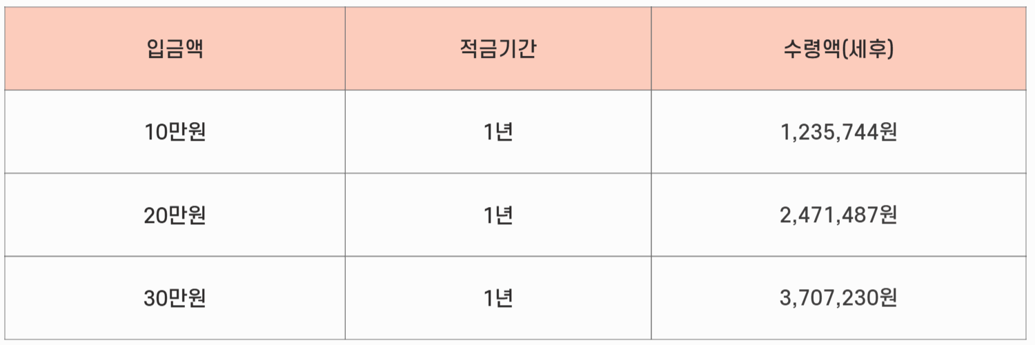 ◾ 월 10만 원 시 세전이자 42,250원이며 세후수령액은 1,235,744원입니다.