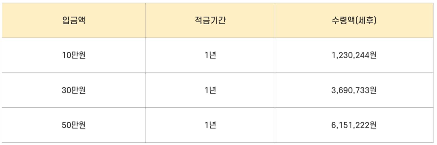 • 기본 12개월 연 수익률은 3.0% p로 500,000만 원으로 12개월 납부 시 6,082,485원입니다.
